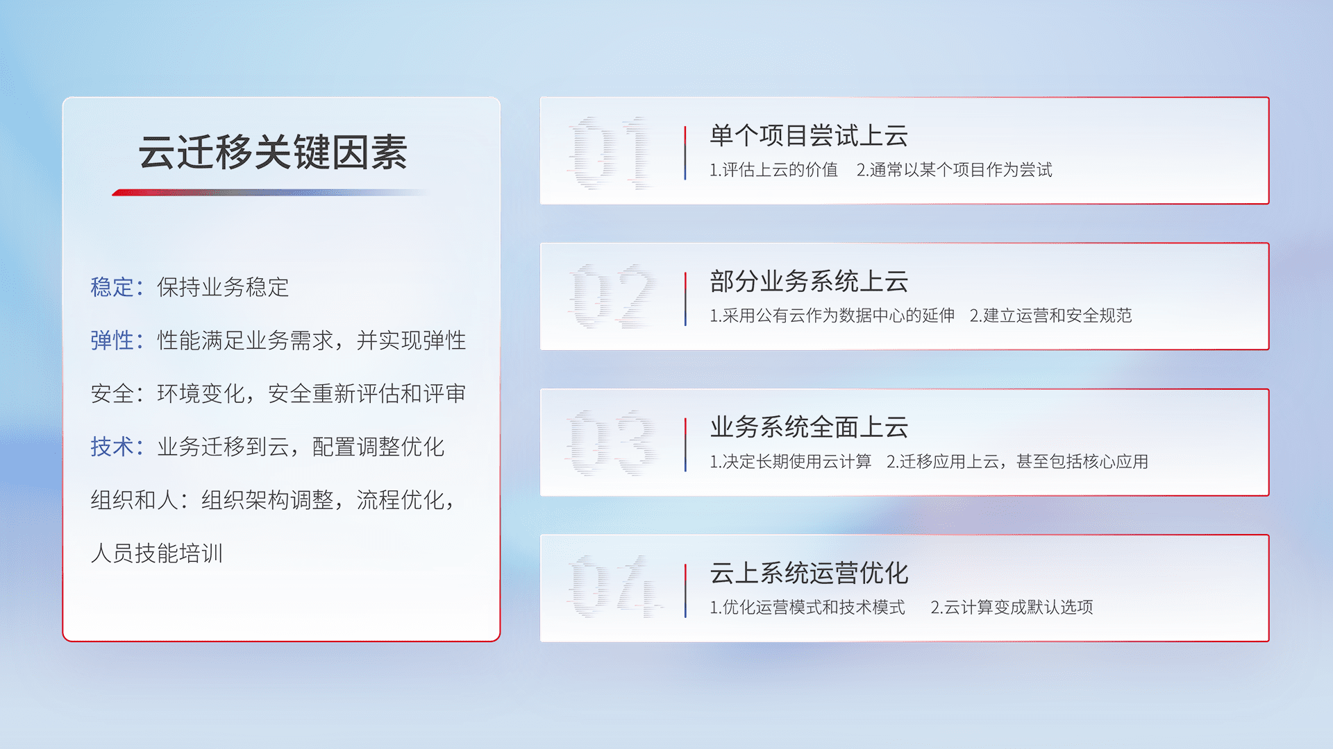 结合实际业务,,,,从规划设计、、、、云平台选型、、、云原生改造、、、、数据迁移、、、集成交付,,,迁移全过程为客户识别最佳上云路径,,,做好风险识别管理,,,,设计网络架构、、身份权限、、安全审计合规、、、、操作审计、、日志审计、、监控告警策略、、、多站点容灾设计等,,,对云上基础设施进行整体规划,,提升IT治理水平,,以满足弹性、、、、高可用、、、高性能的需求。。