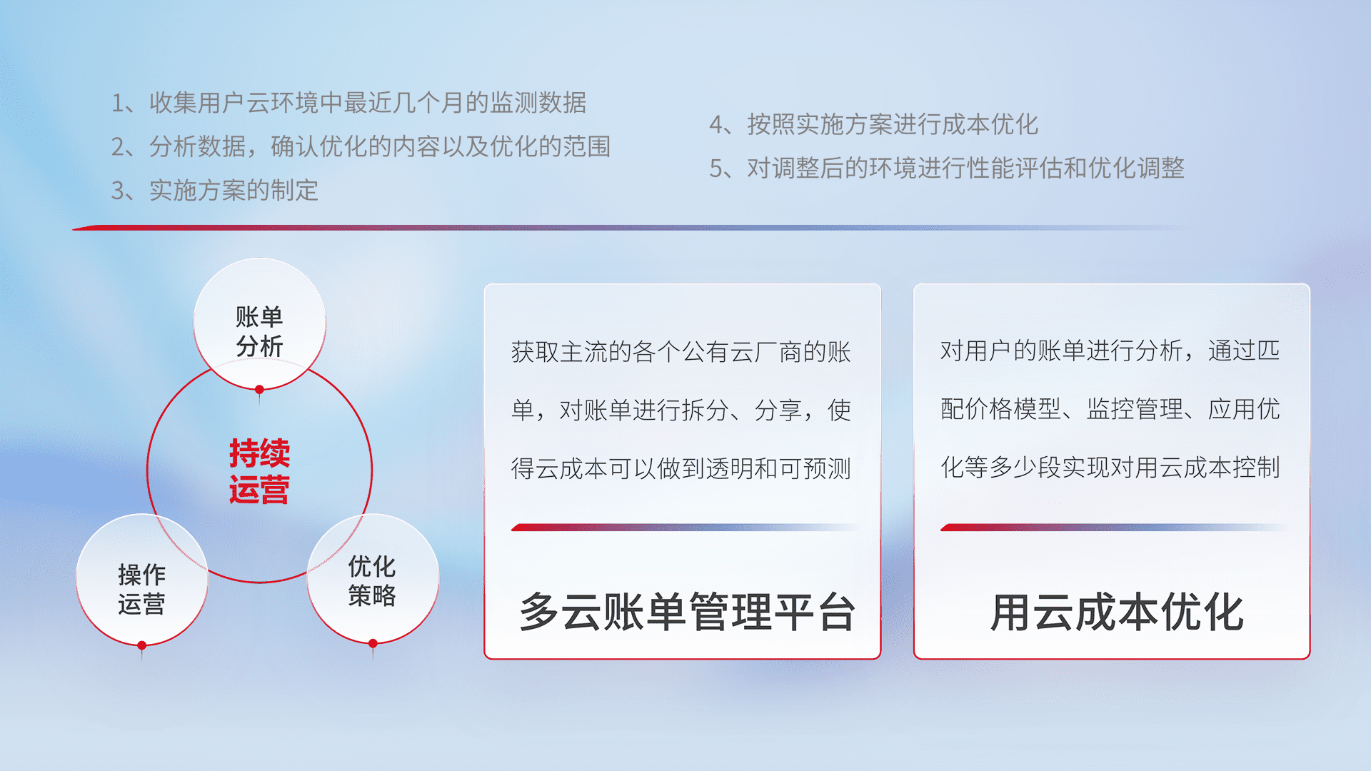通过多云纳管,,以统一的资源数据模型把客户的云资源进行抽象和封装,,,进而实现对多云资源的统一操作,,保障云资源管理的可靠性、、、、稳定性与可用性。。量身定制化运维内容,,配置、、、、开发运维、、、、补丁管理、、、、备份、、、监控、、认证和访问管理、、审计和日常巡检等,,,,保障在用云过程中的可靠度,,,稳定度以及高可用率。。。。