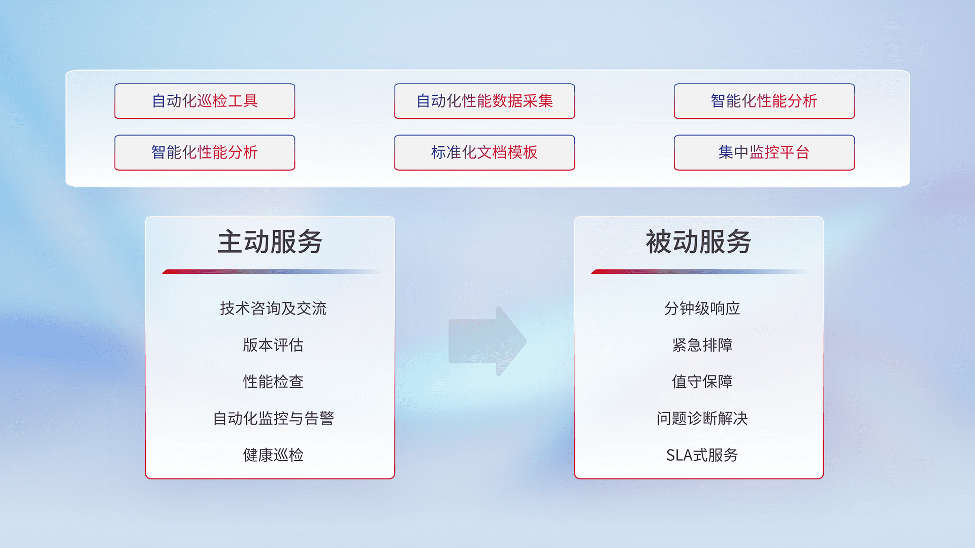 智能化工具和标准化文档,,,保障服务质量,,提供主动服务(包含技术咨询、、、版本评估、、、性能检查、、、自动化监控与告警、、、、健康巡检)和被动服务包含(分钟级响应、、、、紧急排障、、值守保障、、、问题诊断解决、、SLA服务)。。